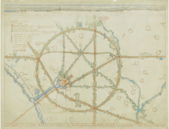 In Cities in Evolution (1915), Geddes includes just one diagram, illustrating the social and spatial potential to be found in rural urban relations (ill. 1) : on the left, the star-like form of the city radiates from a center at intersecting axes, and on the right, the reciprocal force of the country pushes back into the city, yielding an articulate, ruffled edge condition - where the qualities of rural and urban side by side were capitalized upon by elongating that edge of strong contrasts and defining it with civic structures, playgrounds and parks for nature study (GEDDES 1915).