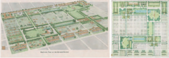 At that moment in history, the prototypical morphology of this alternative model of the city was anticipated by Olmsted and Vaux’s project for the Riverside community in Chicago (1868-1870) (ill. 8) – where you will recall Wright’s Coonley house terrace later served to illustrate the Deweys’ idea of the “school of tomorrow”.