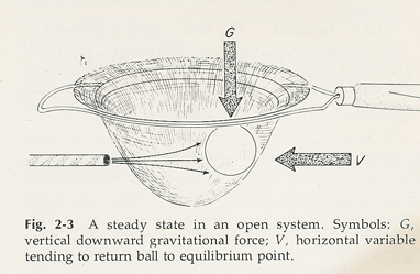 This principle or theorem was originally stated after a consideration of the thermodynamics of closed systems, but it has been adapted for open systems by Prigogine. Furthermore, a related theorem has been developed by Prigogine concerning steady states in open systems. He has stated that, for a fairly general class of cases, such steady states approach minimum entropy production. It is possible for entropy not to increase in such systems, and they are able to maintain steady states. Figure 2-3 represents one possible model for such a system in steady state. If a ping-pong ball is held in a kitchen strainer,